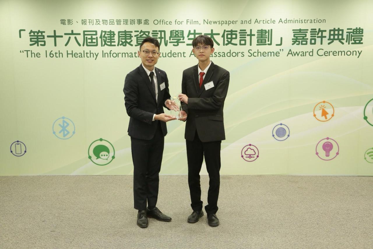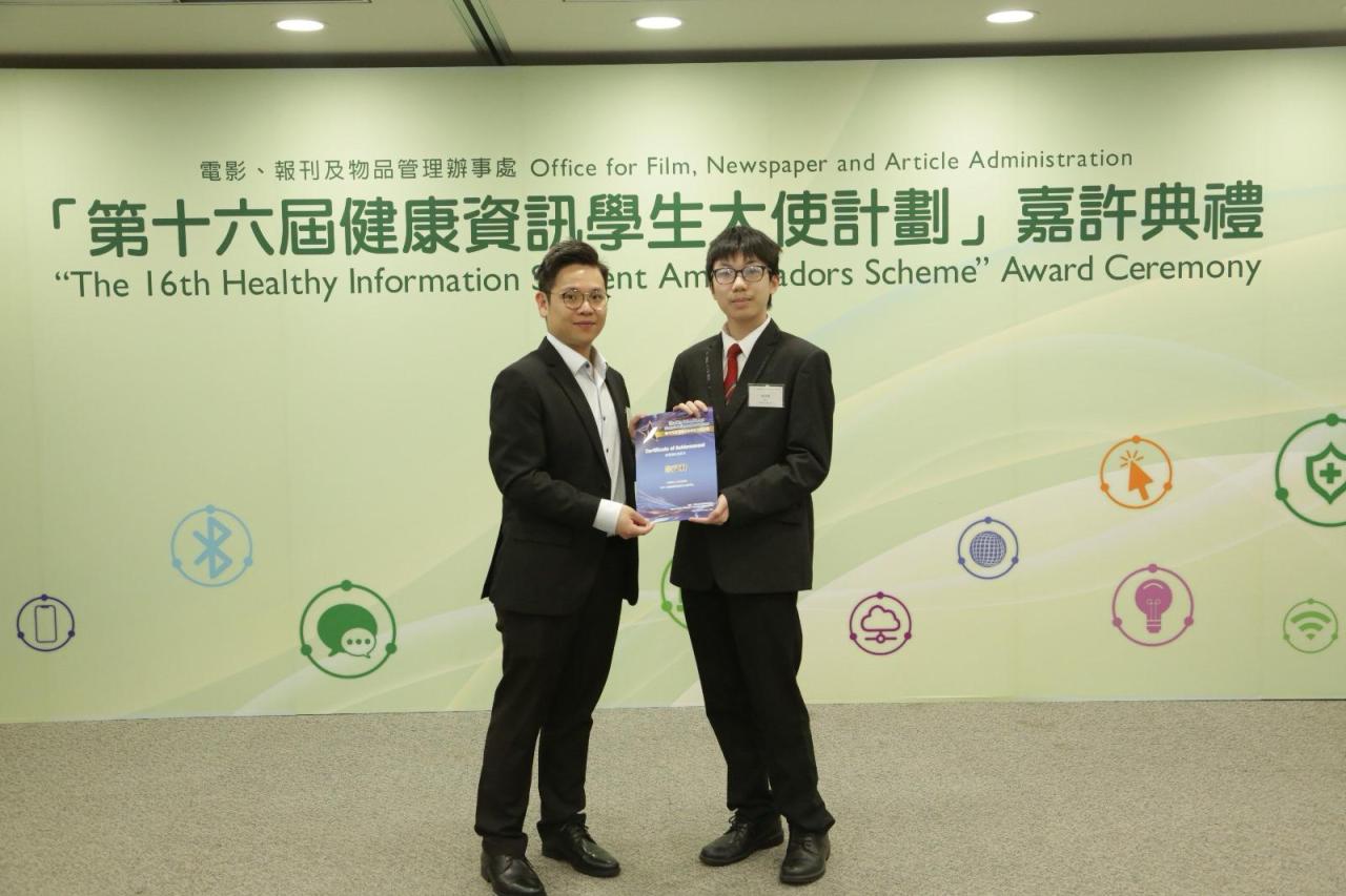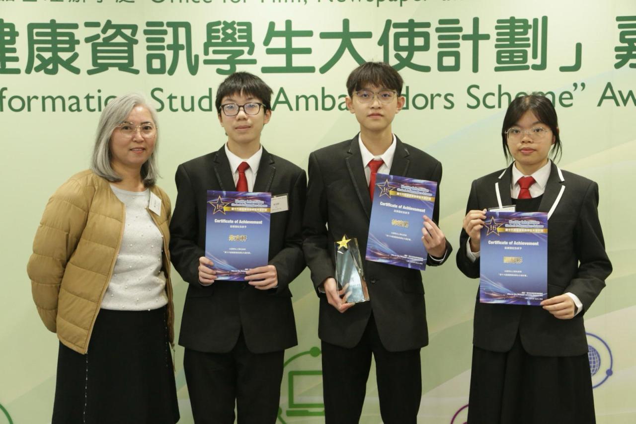 三位中四同學於早前參加了由電影、報刊及物品管理辦事處舉辦的第16屆健康資訊學生大使計劃,協助政府向公眾宣傳淫褻及不雅管制條例,並接受相關培訓。其中4D林曉男同學獲頒卓越表現獎狀和獎座,4A關鄯彤和4B朱文軒同學獲頒優異表現獎狀。
