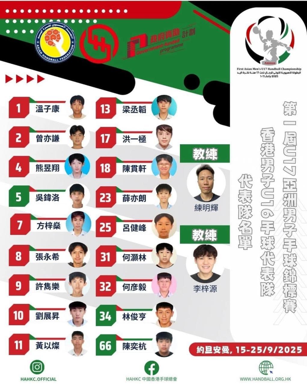 We are thrilled to announce that four of our talented students proudly represented the Hong Kong Handball Team at the First Asian Men's U17 Handball Championship, held from September 15 to 25, 2025, in Amman, Jordan.