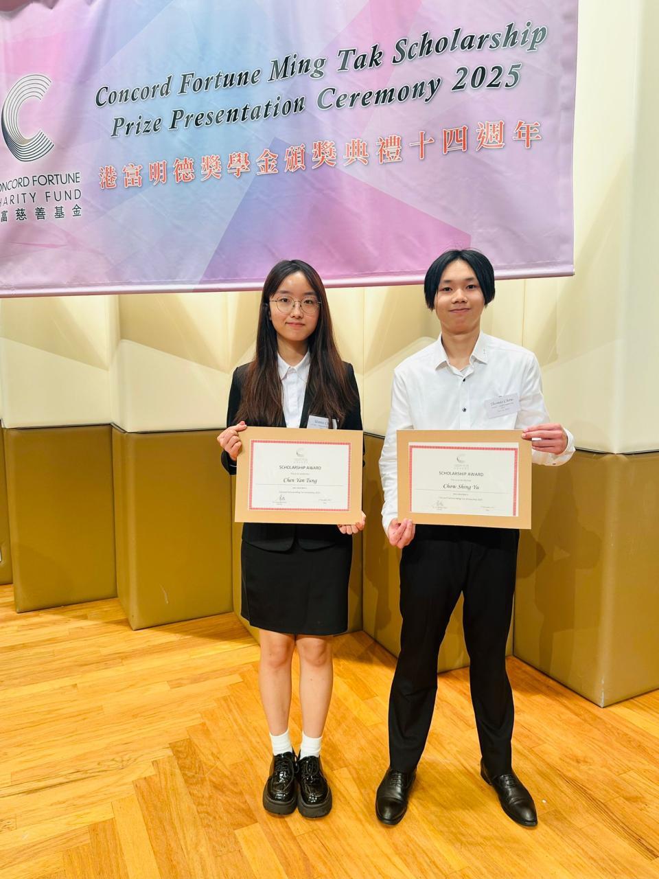 The Concord Fortune Ming Tak Scholarship provides capable students with limited financial resources an equal opportunity to pursue higher education. Congratulations to Chen Yan Tung and Chow Shing Yu for being awarded this scholarship, which covers most of their university tuition for four years. We extend our heartfelt thanks to the donor for their generous support in making this possible.